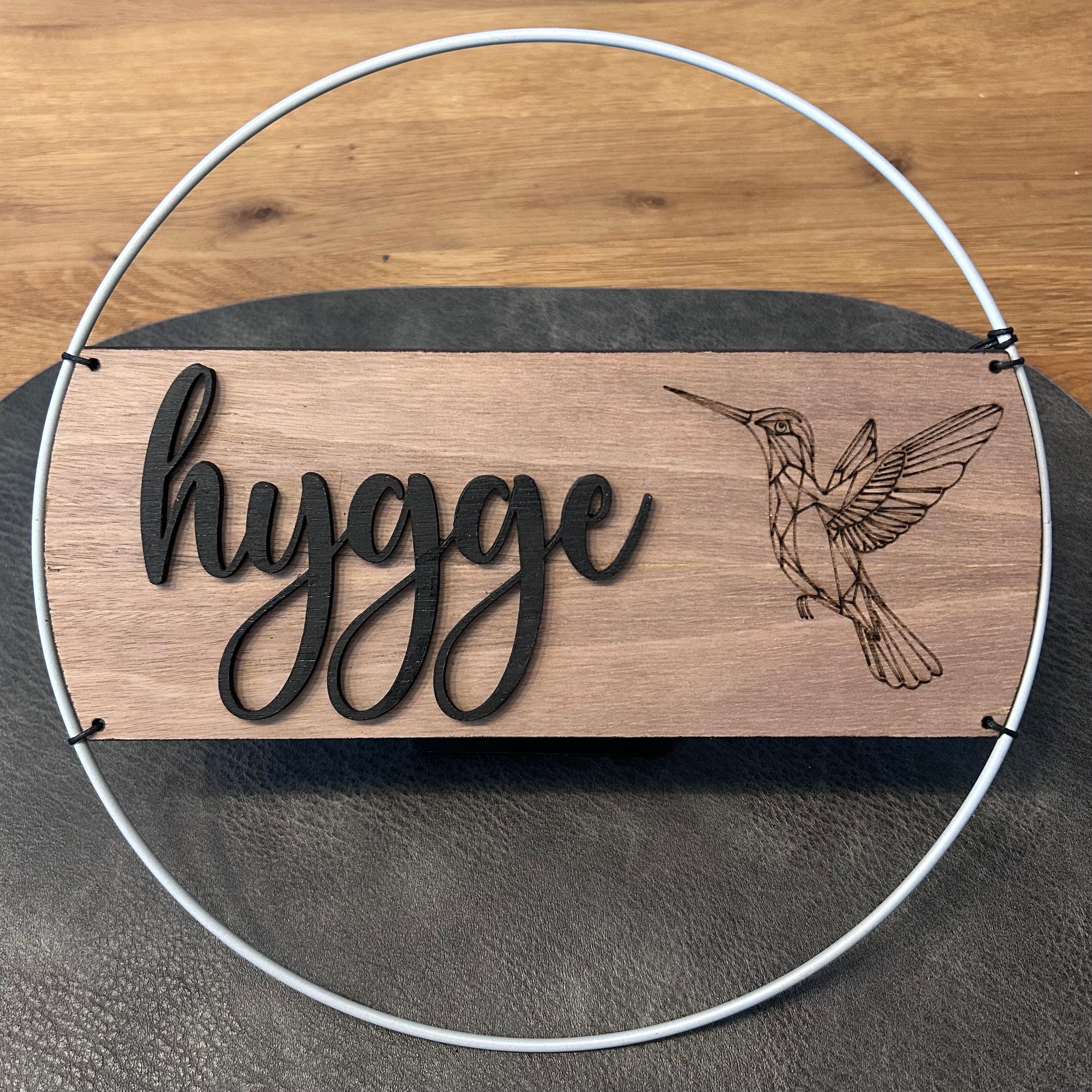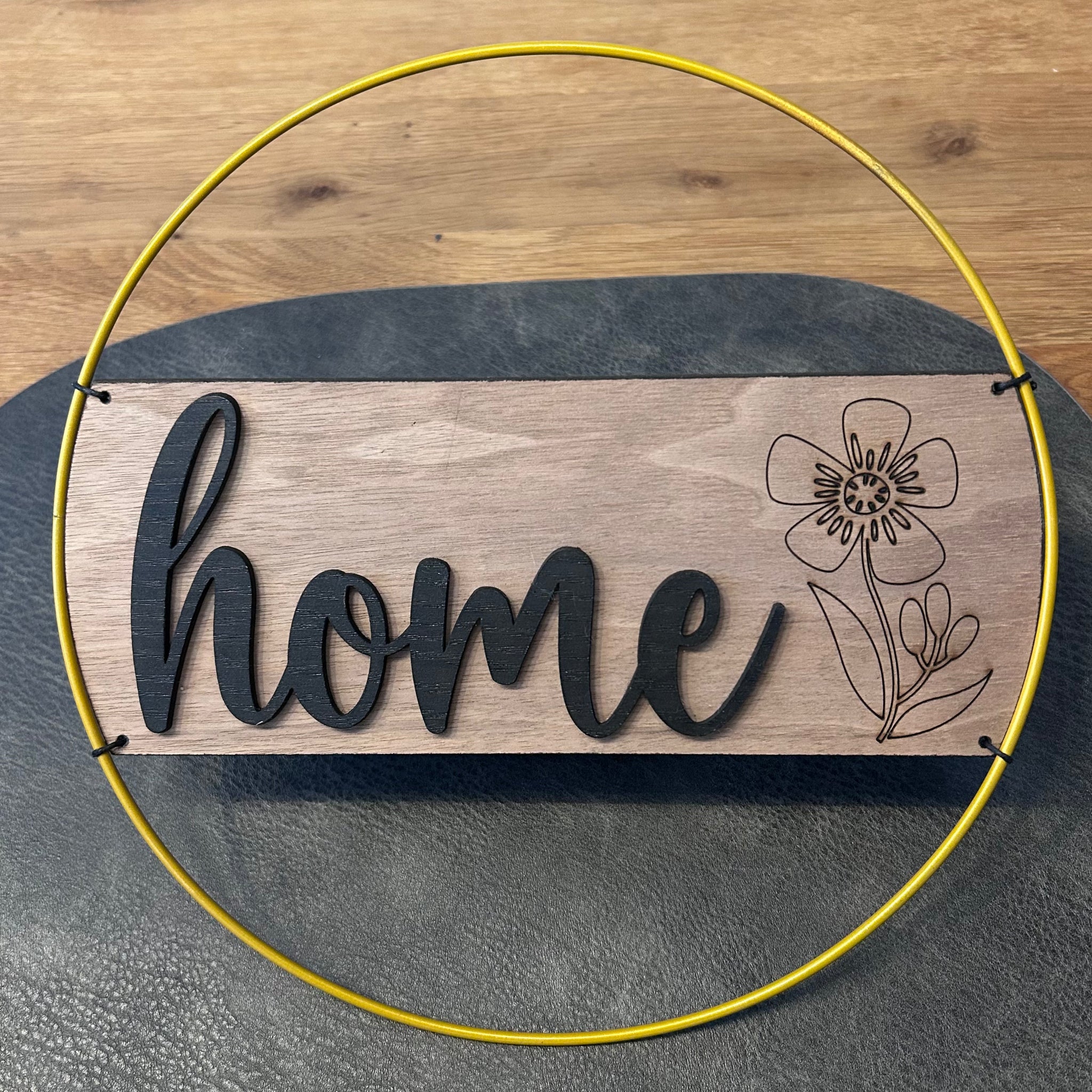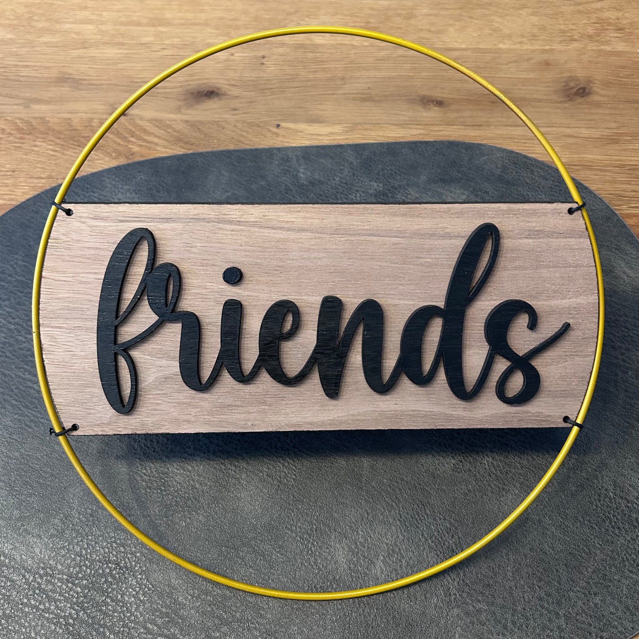Dieser stilvolle Metallring in drei verschiedenen Farben (Ø 25 cm) kombiniert modernes Design mit natürlicher Eleganz. Eine Holzplatte aus Walnuss trägt einen gelagerten Schriftzug, ergänzt durch eine Grafik auf der Seite – so entsteht ein dekoratives Highlight für Zuhause oder als persönliches Geschenk.