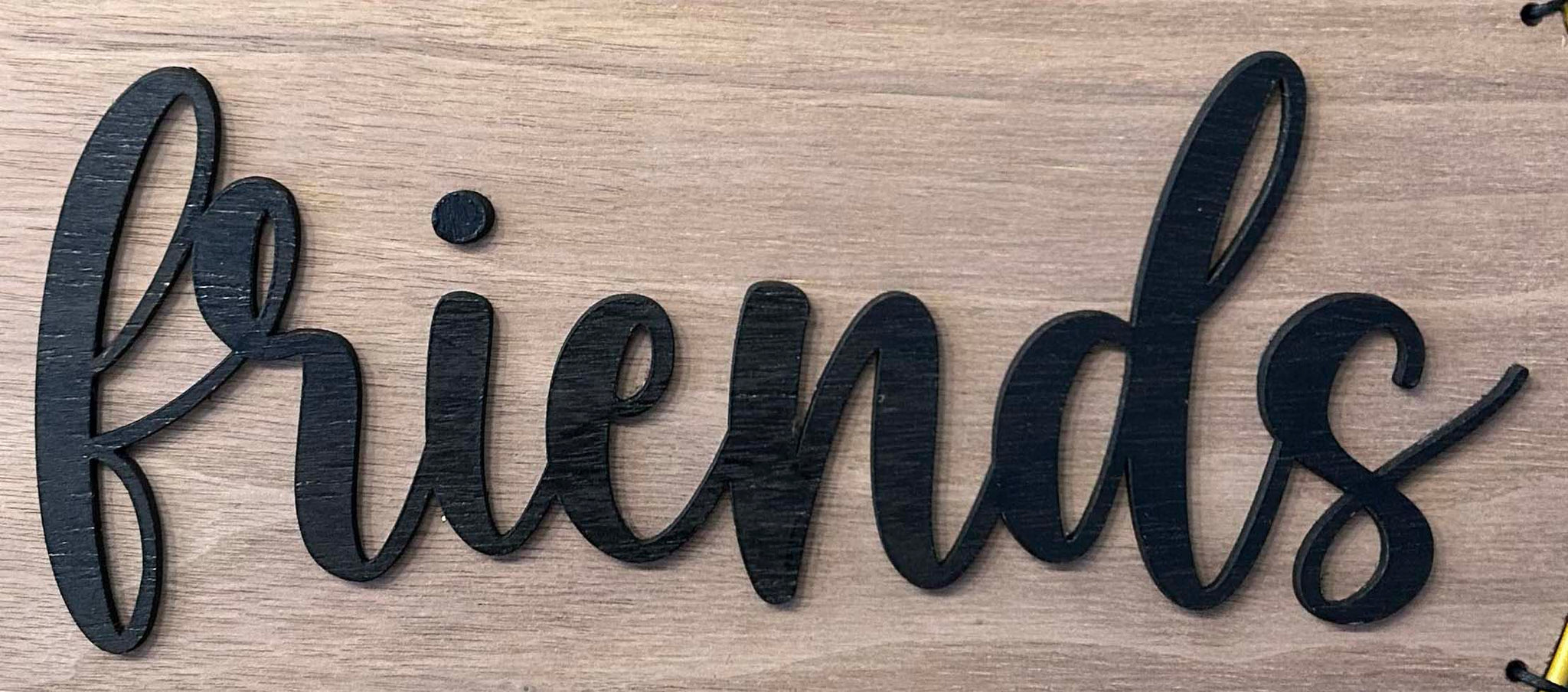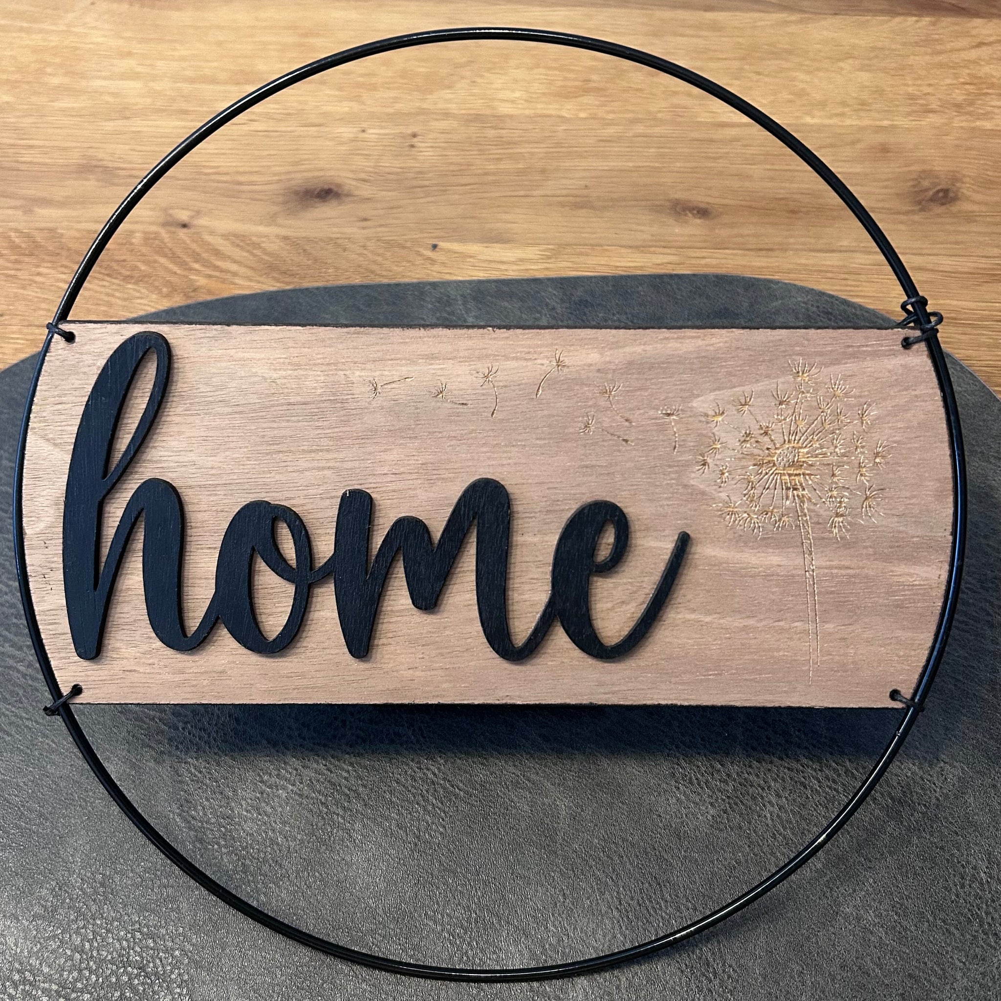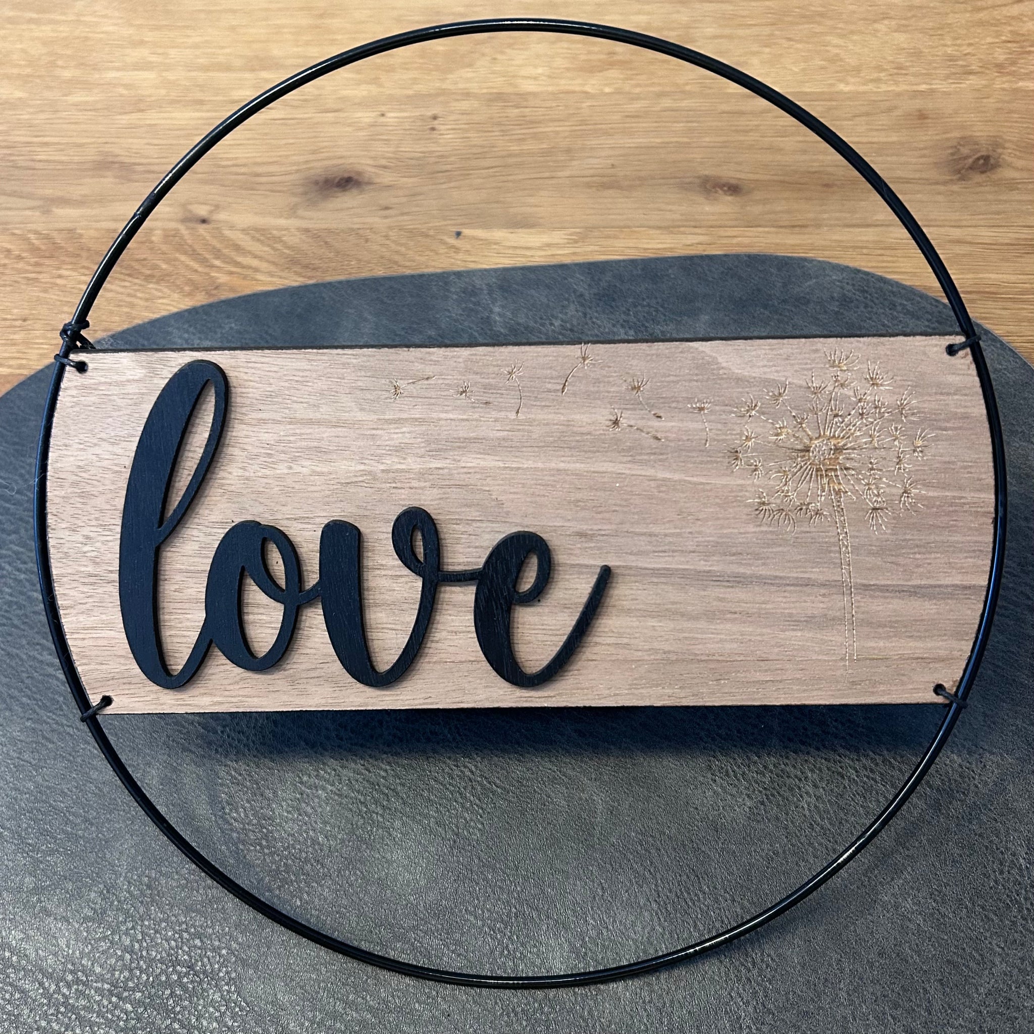 Dieser stilvolle Metallring in drei verschiedenen Farben (Ø 25 cm) kombiniert modernes Design mit natürlicher Eleganz. Eine Holzplatte aus Walnuss trägt einen gelagerten Schriftzug, ergänzt durch eine Grafik auf der Seite – so entsteht ein dekoratives Highlight für Zuhause oder als persönliches Geschenk.